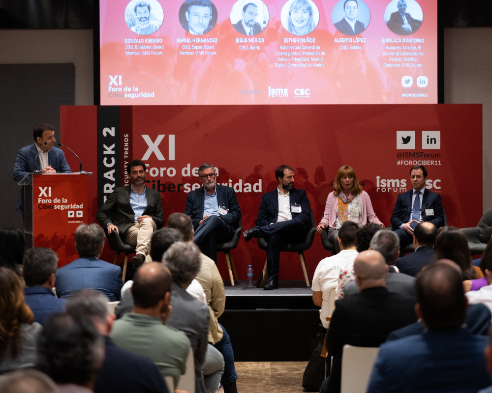 La última mesa redonda bajo el título: “Retos del Buen Gobierno de la Ciberseguridad” formada por Gonzalo Asensio, CISO, Bankinter; Board Member, ISMS Forum; Rafael Hernández, CISO, Cepsa; Board Member, ISMS Forum; Jesús Mérida, CISO, Iberia; Board Member, ISMS Forum; Esther Muñoz, Subdirectora General de Ciberseguridad, Protección de Datos y Privacidad, Madrid Digital, Comunidad de Madrid; Alberto López, CISO, Solaria y como moderador Gianluca D’Antonio, Academic Director, IE Master of Cybersecurity; Partner, Deloitte; Presidente de ISMS Forum. Durante la mesa redonda Jesús Mérida destacó que “El riesgo real es no entender el riesgo en sí mismo y el no facilitar o dotar a la empresa las medidas o medios adecuados para afrontar dicho riesgo… Hoy en día, todo el mundo tiene el riesgo de ciber como uno de los riesgos principales de las empresas. Prácticamente todas las empresas están abordando, por ciertos motivos, porque sea un plan preconcebido o porque la pandemia les ha abocado a ello, a transformación digital de sus procesos de negocio y no puede existir la transformación digital sin la ciberseguridad o al menos, es una irresponsabilidad absoluta el plantear procesos de negocio tecnológicos sin contar con ciberseguridad.”
