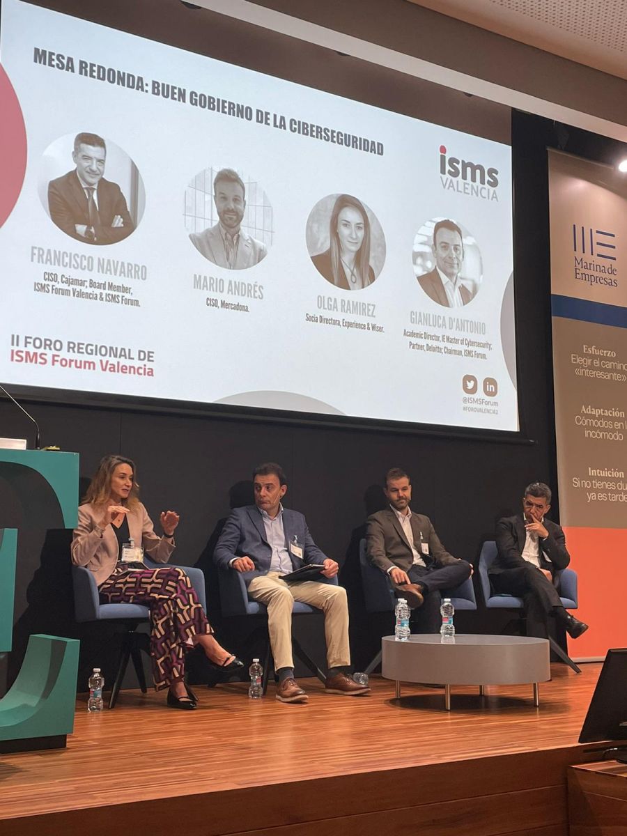 A continuación, contamos con una interesante mesa redonda bajo el título: “Buen gobierno de la ciberseguridad” de la que formaron parte Francisco Navarro, CISO, Cajamar; Board Member, ISMS Forum Valencia & ISMS Forum; Mario Andrés, CISO, Mercadona; Olga Ramírez, Socia Directora, Experience & Wiser y como moderador de la mesa contamos conGianluca D’Antonio, Academic Director, IE Master of Cybersecurity; Partner, Deloitte; Chairman, ISMS Forum donde se destacó “Un ransomware no se resuelve en dos horas y eso hay que explicárselo a la empresa. Hay que involucrarlos en esa toma de decisiones cuando haya un problema, nosotros, los CISOs, vamos a trabajar para que no pase o minimizar la probabilidad de que pase, pero cuando ocurra tenemos que decidirlo todo de la mano del negocio” asegura Mario Andrés.