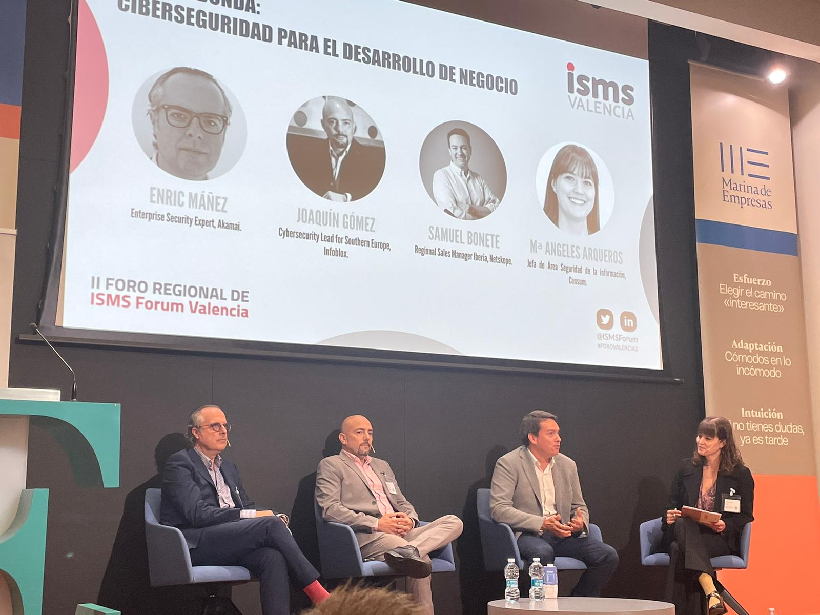 A continuación, fue el turno de la segunda mesa redonda formada por Enric Máñez, Enterprise Security Expert de Akamai; Joaquín Gómez, Cybersecurity Lead for Southern Europe de Infoblox; Samuel Bonete, Regional Sales Manager Iberia de Netskope; como moderadora, Mª Ángeles Arqueros, Jeda de Área Seguridad de la Información de Consum. Dicha ponencia giro en torno a la ciberseguridad para el desarrollo del negocio, durante la misma se destacó que “el objetivo es una buena experiencia, pero con seguridad y en un modelo de privilegio mínimo. La lección aprendida es que se puede hacer” comentó Samuel Bonete.