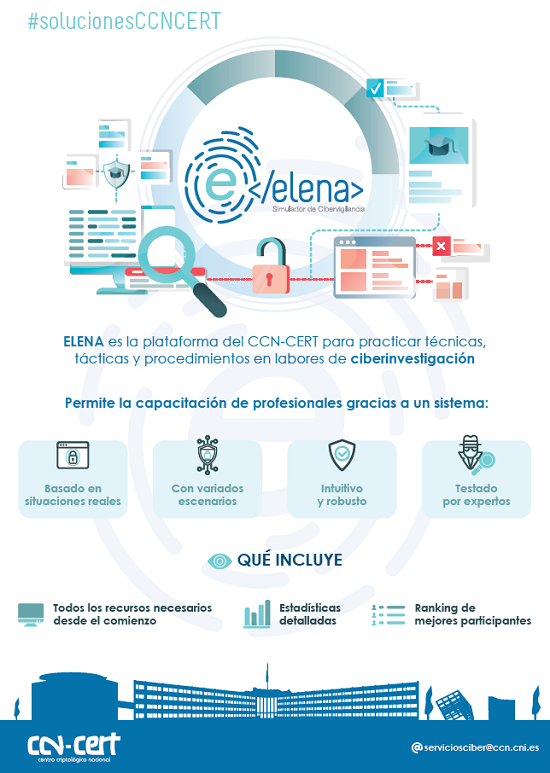 El Centro Criptológico Nacional, adscrito al Centro Nacional de Inteligencia, ha desarrollado una nueva solución para facilitar la capacitación de los profesionales en ciberseguridad: ELENA; una plataforma que permite a los usuarios adentrarse en el ámbito de la ciberinvestigación y practicar las técnicas, tácticas y procedimientos necesarios para realizar labores de este tipo en cometidos de prevención y análisis de ciberamenazas.
