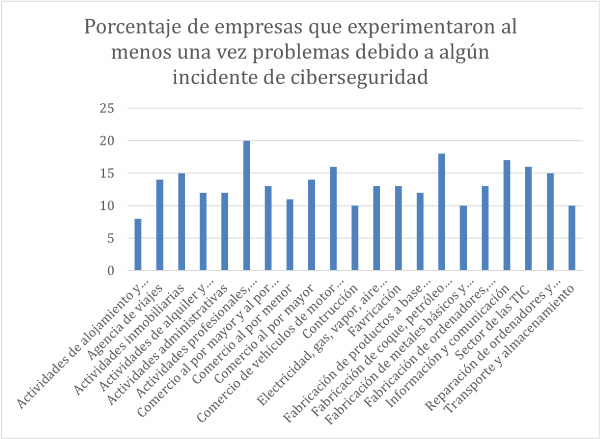 El sector relacionado con actividades profesionales, científicas y técnicas es el que más incidentes de seguridad identificó llegando a un 20% de empresas. El 18% de las empresas relacionadas con el sector industrial de actividades petrolíferas y el 17% de las empresas de información y telecomunicaciones detectaron incidentes de ciberseguridad.