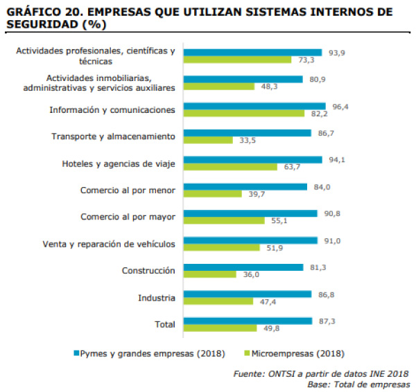 Por sectores empresariales las empresas que utilizan sistemas internos de ciberseguridad es el siguiente, fuente Informe E-Pyme del 2018 de ONTSI.