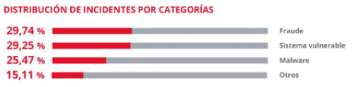 El fraude es el tipo de incidente más gestionado, ocupando el 29.74% del total de incidentes. Los casos de fraude engloban cualquier tipo de uso no autorizado de recursos empleando tecnologías o servicios por usuarios no autorizados, como la suplantación de identidad, violación de derechos de propiedad intelectual u otros engaños con objetivos económicos.